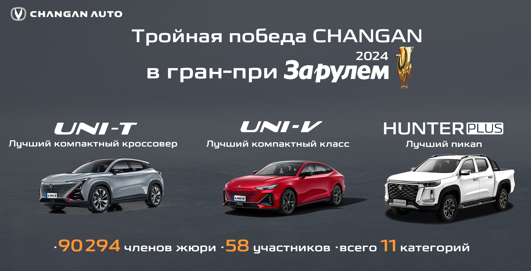 30 мая, Москва. Модели Changan Uni-V, Changan Hunter Plus и Changan Uni-T стали лидерами в трех категориях автомобильной премии Гран-при «За рулем» – 2024. Бренд Changan получил наибольшее количество призовых номинаций.
